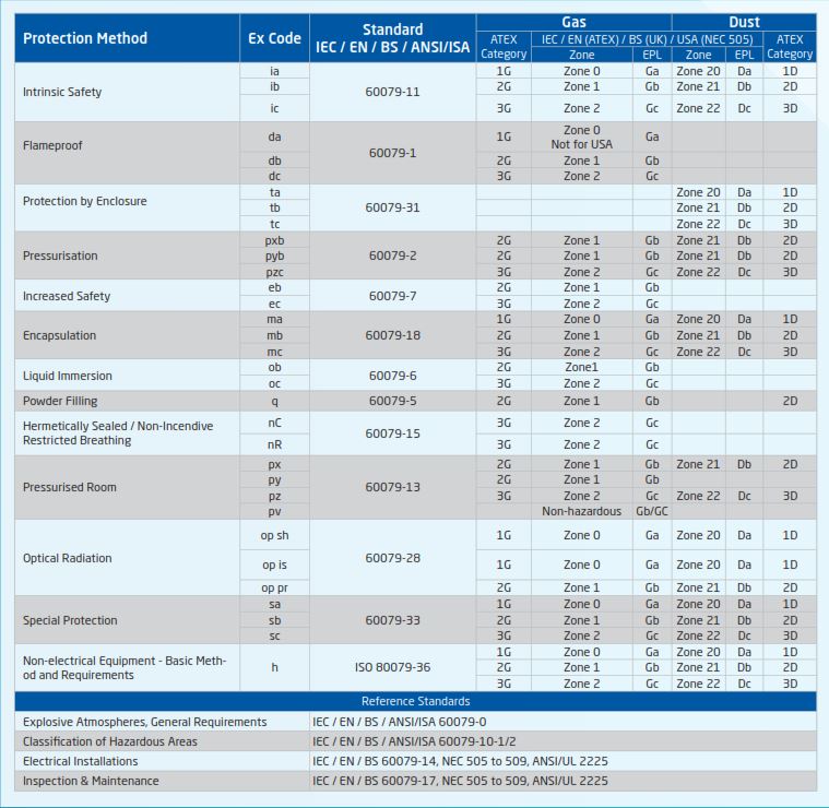 وفقًا لنوع ونوع الحماية ، فإن منتجاتنا مناسبة للعمل في مناطق Ex ، المناطق 0 ، 1 ، 2 ، 21 و 22 ، بما في ذلك الغازات والأبخرة والضباب والغبار.
