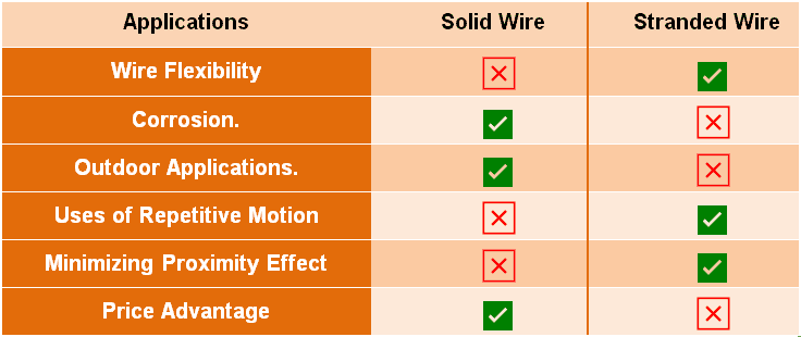يوضح الجدول التالي الاختلافات والمقارنة بين الموصل الصلب والموصل المجدول وفقًا للظروف والتطبيقات الخاصة.