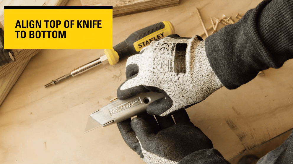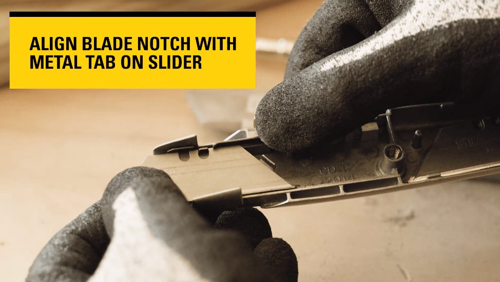 قم بمحاذاة شقى الشفرة مع العلامة المعدنية على شريط المنزلق